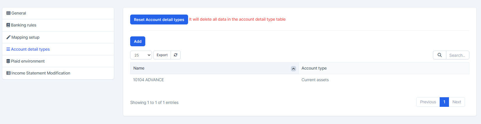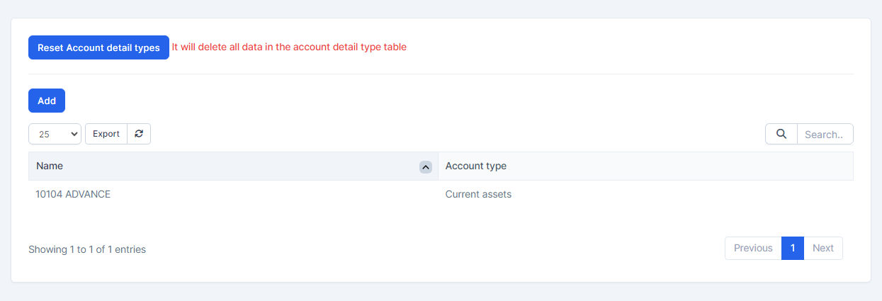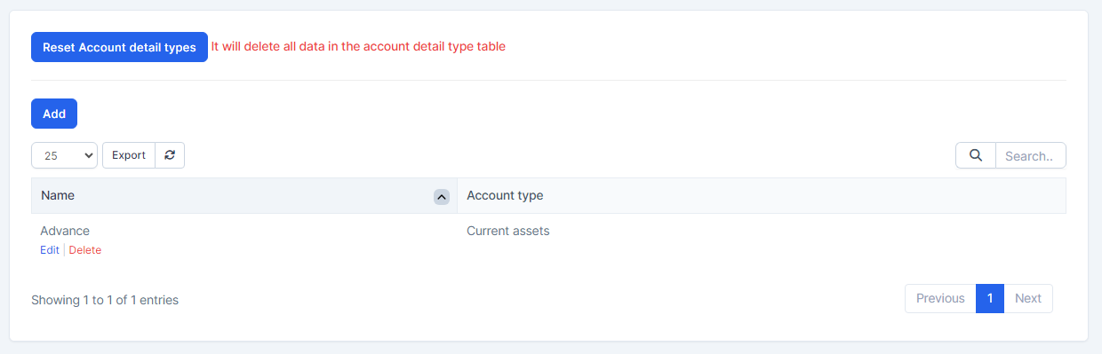 Reset Account detail type: Delete all detail types in this screen but accounts of this detail type are not deleted.