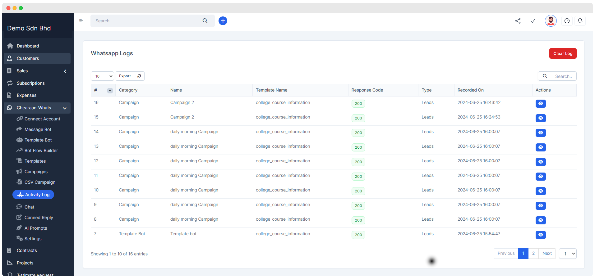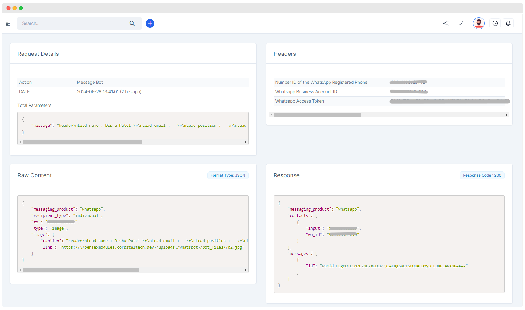 The Activities Logs table records interactions between your bots and WhatsApp API responses, This information helps you monitor the performance of your messaging system, ensuring messages are sent successfully or not and identifying any errors.