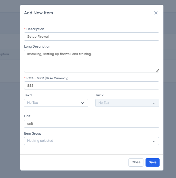 - Tax – Apply item predefined tax, the tax will be auto-applied when creating new invoice/estimate/proposal/credit note