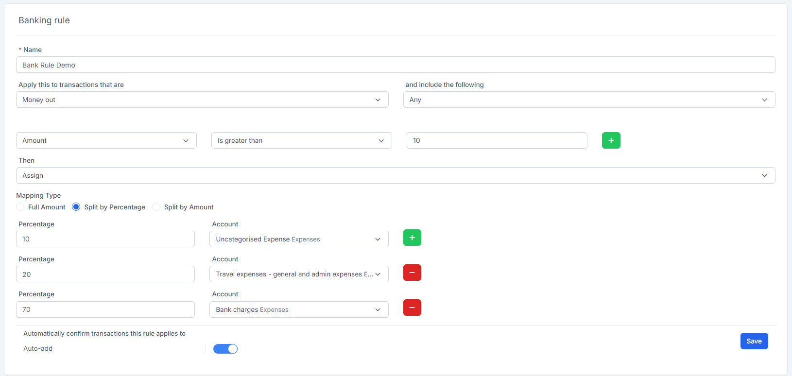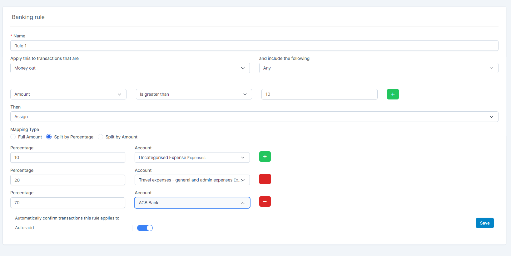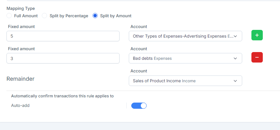 The amount is divided into parts and mapped to each account selected in the banking rule