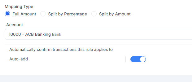 - 9. Enable the Auto-add: Any transaction that meets the conditions of the rule will automatically be mapped to the Payment account and Deposit to preselected in the rule.