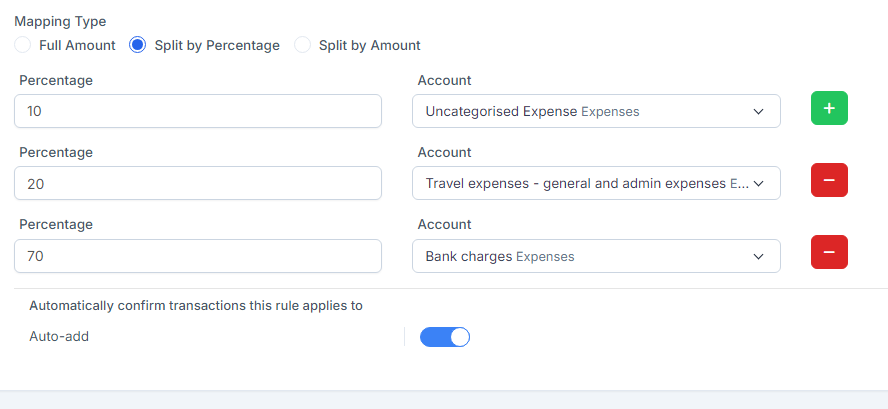 If you choose Split by Percentage, the amount will be divided by percentage and mapped to each account