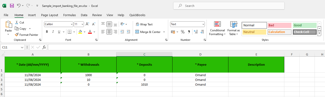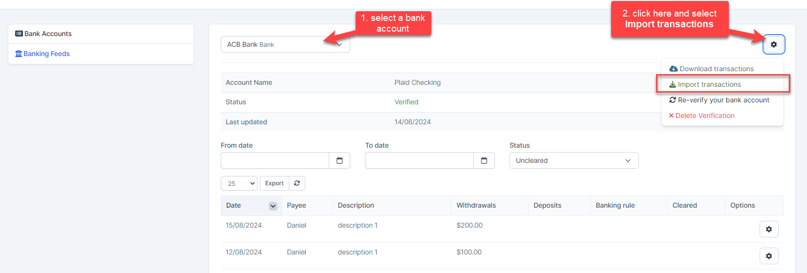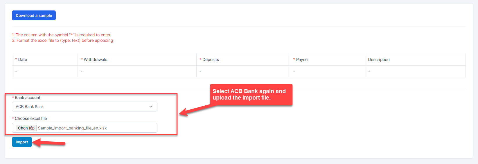Step 2: Go to Banking -> Banking Feeds→ Click on the gear icon in the right corner and select Import transactions--> then import excel into ACB Bank with the file as shown below