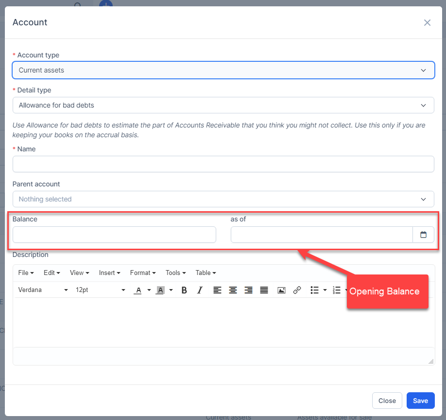 5. Enter the Balance and as of (optional). Only specialized account types show this field.
