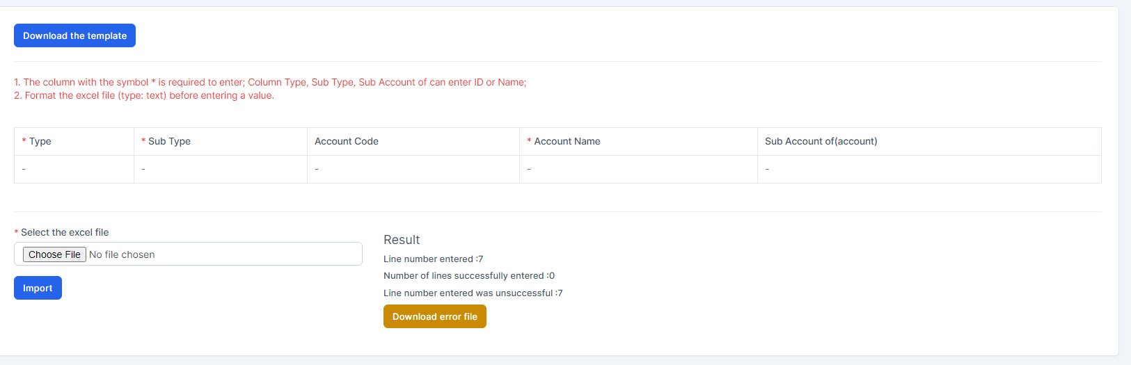 In case the import fails, the Download error file button will be displayed. To see the import error, click Download error file to download this file and see the error.