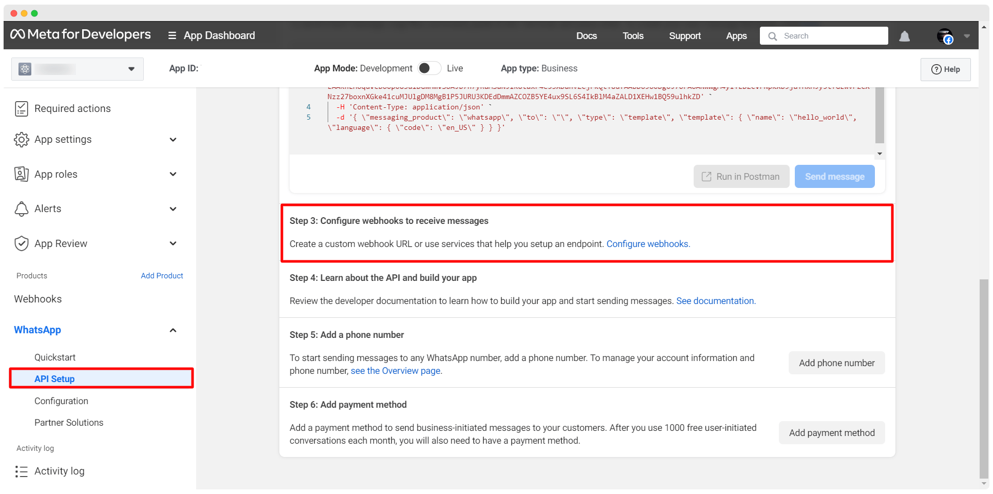 Configure the webhook to receive messages. To do this, go to step 3 from the API setup and click on the "Configure webhooks" link.