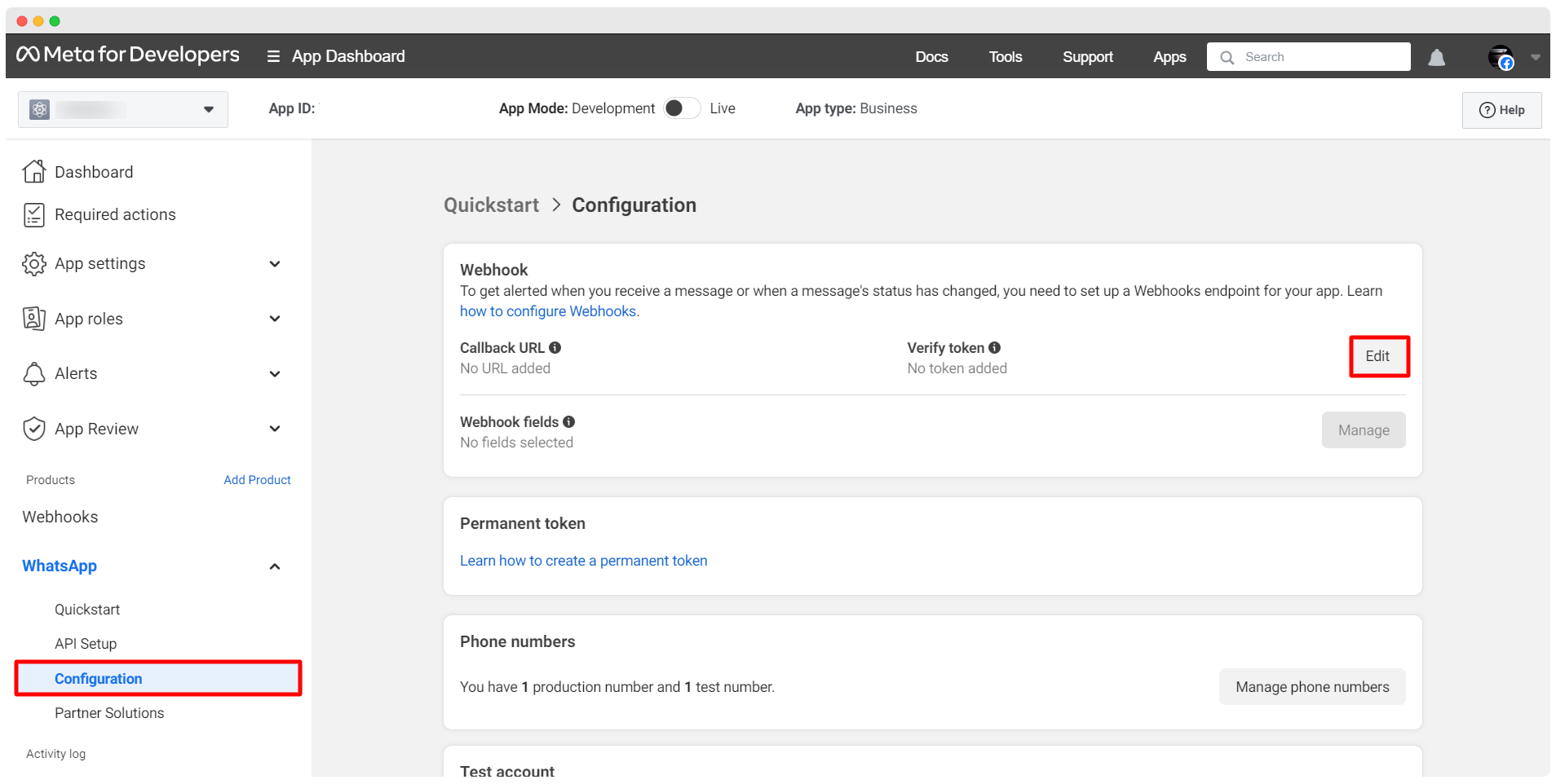 A page called "Configuration" will appear. In the webhook section, click the edit button.
