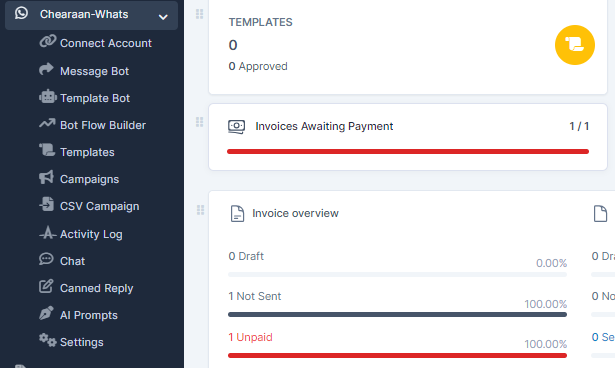 Proceed to the dashboard. Click the connect WhatsApp menu in the left sidebar's WhatsApp area. Enter the access token and WhatsApp business account ID.