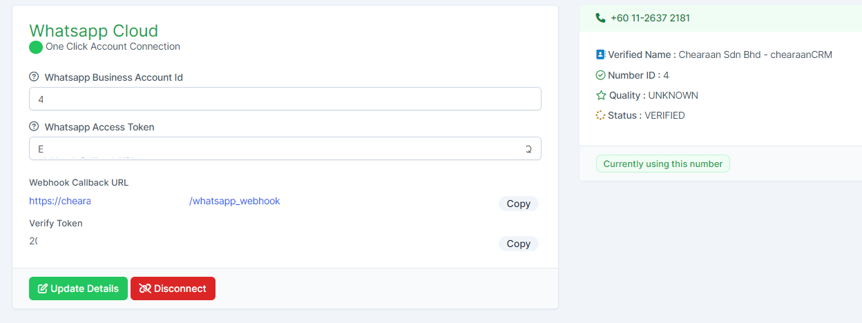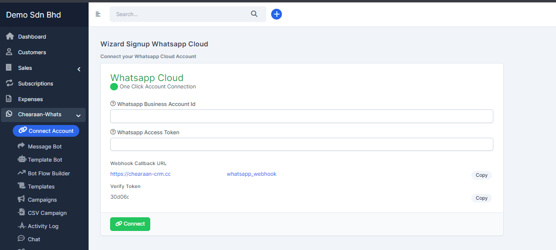 Click on the Connect Account sidebar link under the Chearaan-Whats Menu. The Connect WhatsApp Business page will show the Webhook Callback URL and verify token at the top.