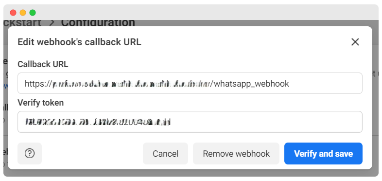 Provide the callback URL and verify the token. To get these, go to the Whatsbot module's sidebar menu.