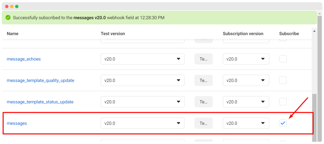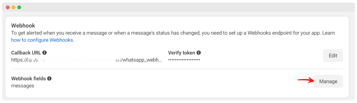 Select webhook fields by clicking the Manage button. A modal will appear with some webhook fields. Subscribe to the Message webhook field and click the Done button.