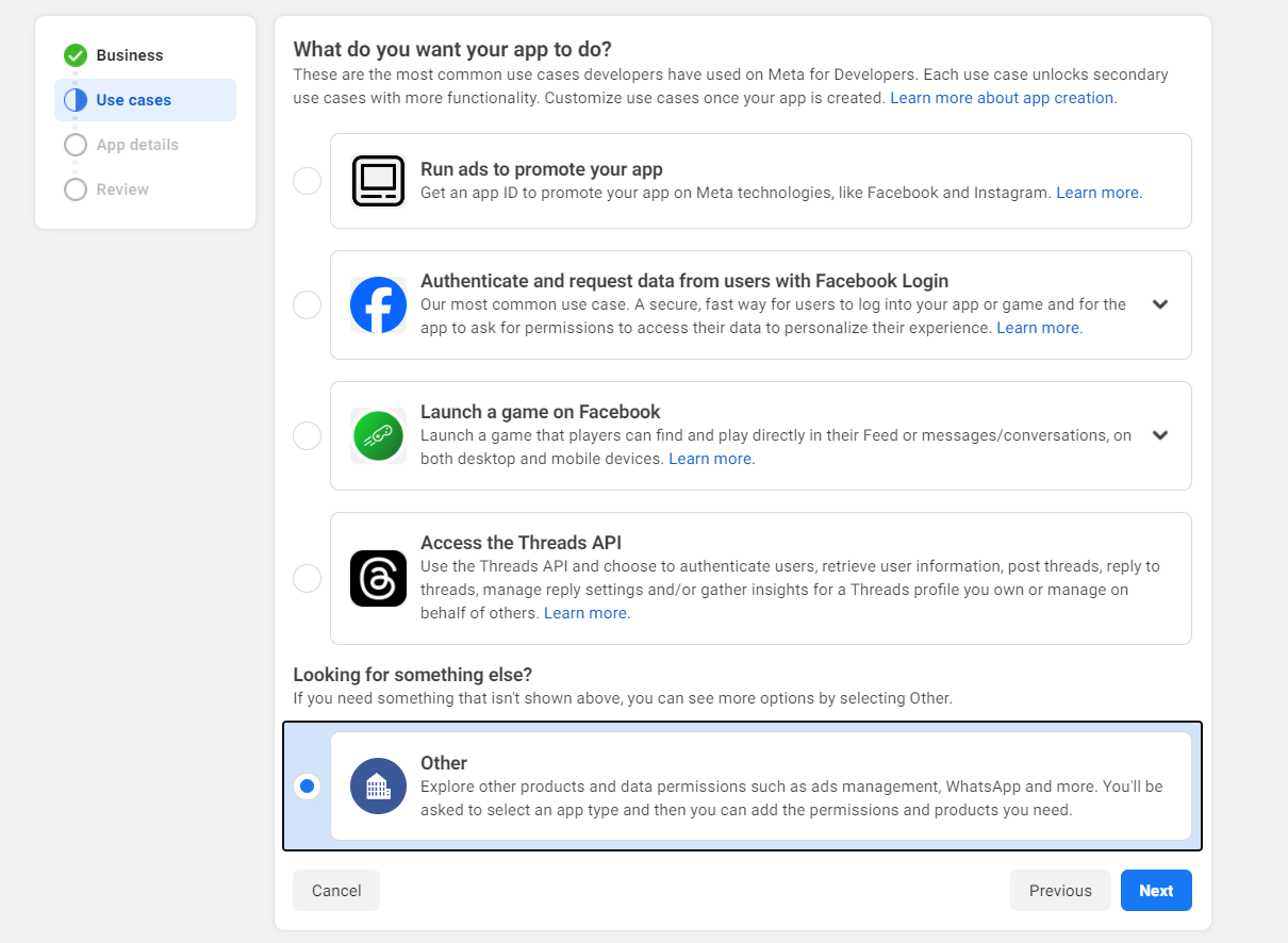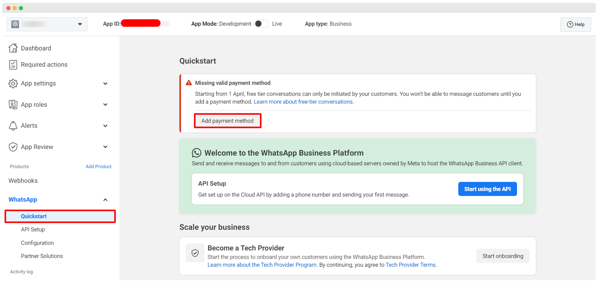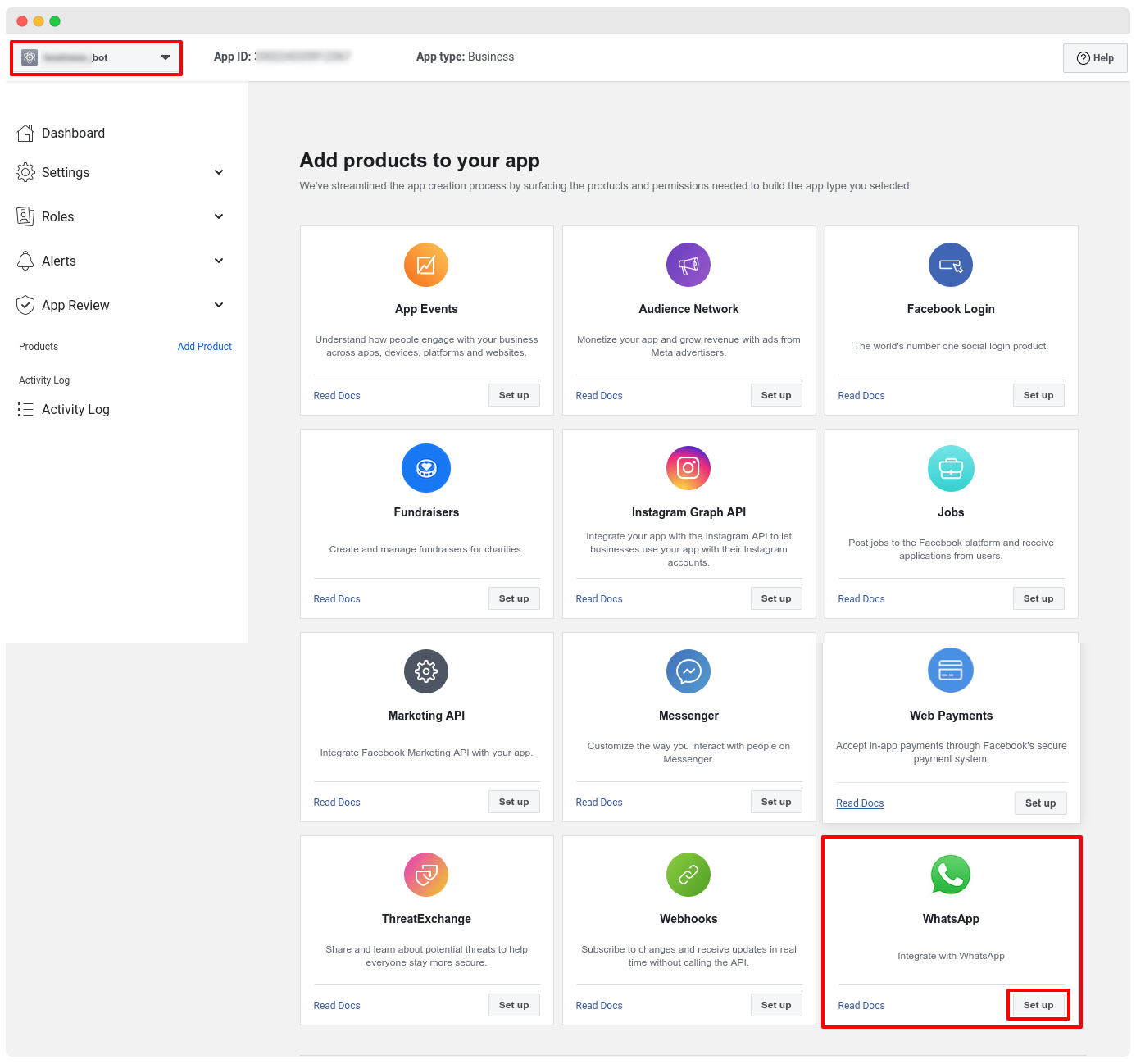 You must add a product to the app using the page. Include WhatsApp since you will be developing one for a business account on WhatsApp. Scroll down to find the WhatsApp section and click the "Set up" button.