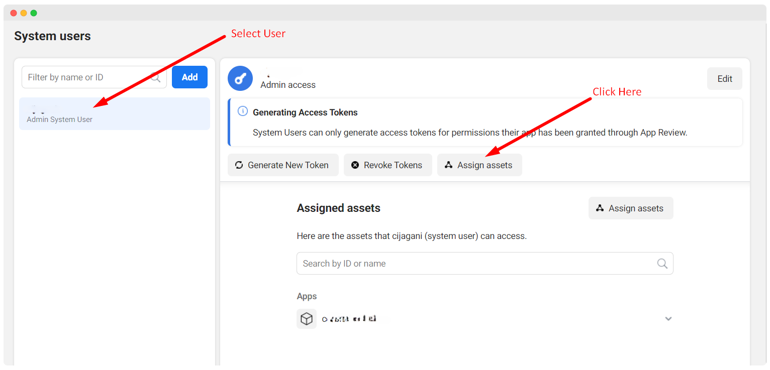 After creating a user, add assets by selecting the user and clicking on the Add Assets button.