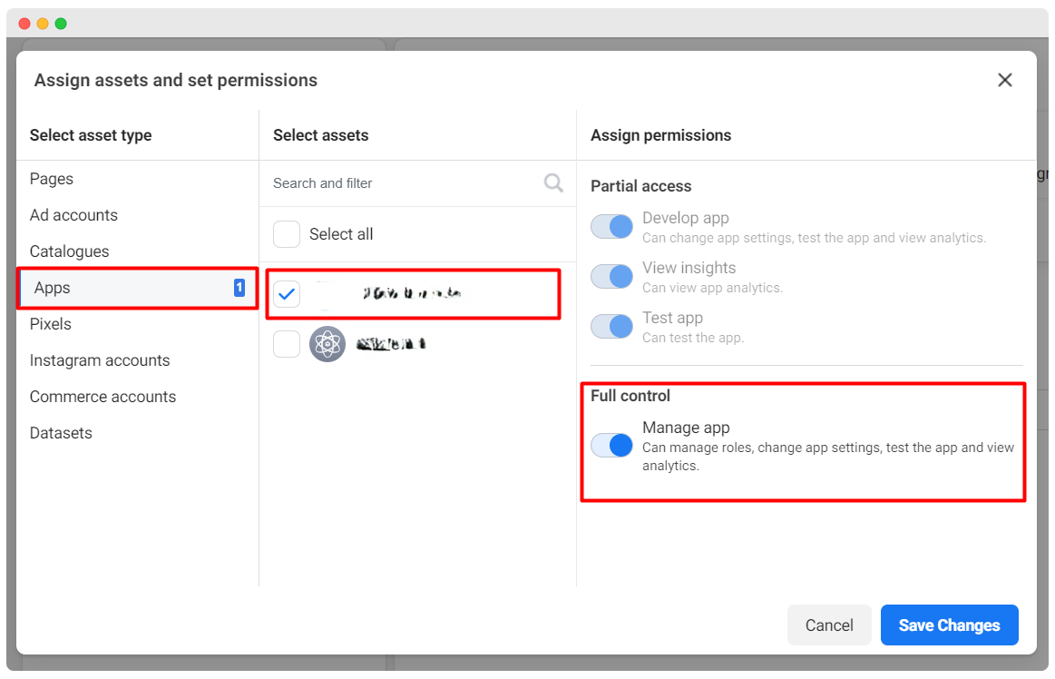 Select the Apps menu from the Select asset type section of the modal. Choose the app and give full control permission. Click the "Save changes" button.