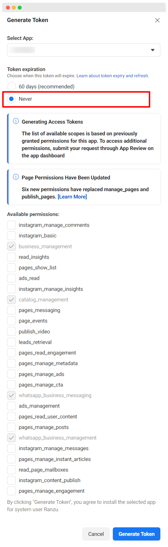 Select the app from the drop-down list in the modal. Choose permissions: Business management, Catalog management, WhatsApp business messaging, and WhatsApp business management. Click the Generate token button