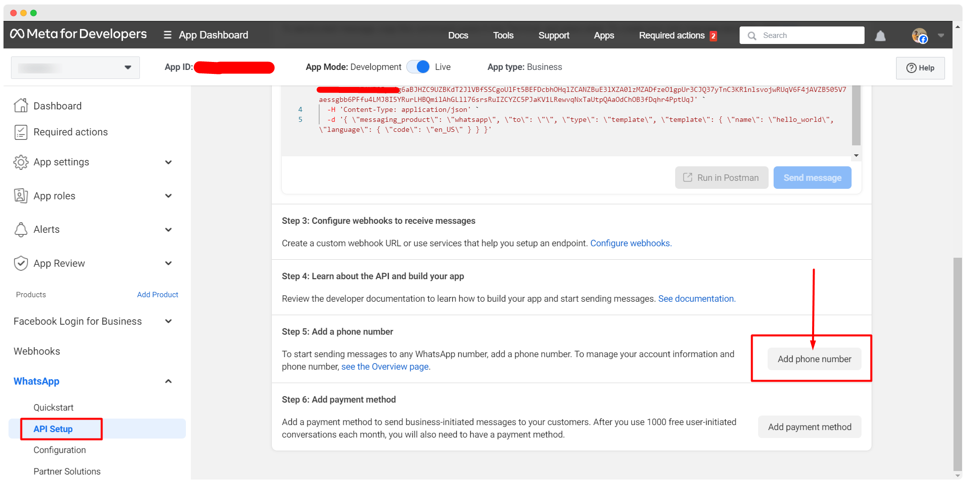 Go to API setup from the left menu and click on the “Add phone number” button to add the phone number for WhatsApp Cloud API.