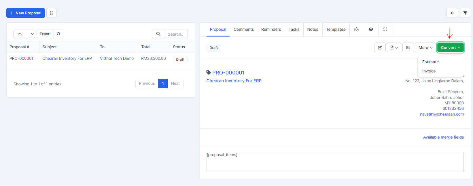 To convert proposal to invoice or estimate select the proposal from the table and on the right side a convert button will be shown