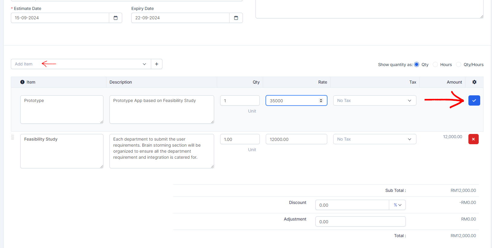 You can add Estimate items, when adding make sure u click on the blue check icon in order the item to be added you can also select tax options see shown in picture.