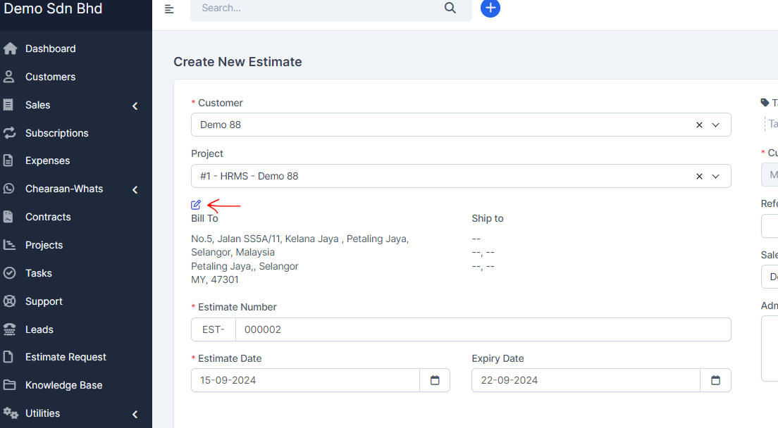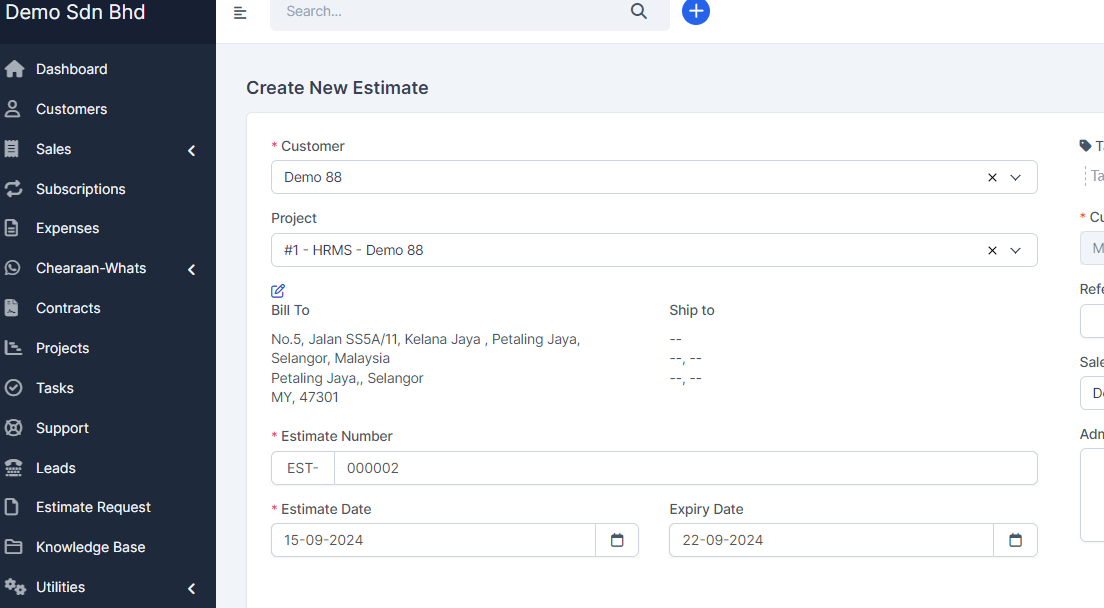 Status – By default the draft status will be selected, you can change the status anytime you want, note that when you send the estimate to your customer the status will be change auto to SENT.