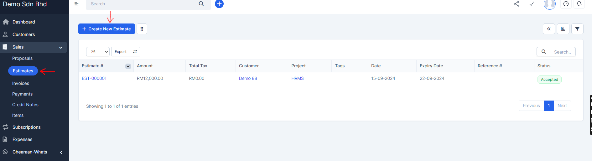 To create new estimate go to Sales -> Estimates -> Create New Estimate or by clicking on the Build icon on the top left side and click Create Estimate