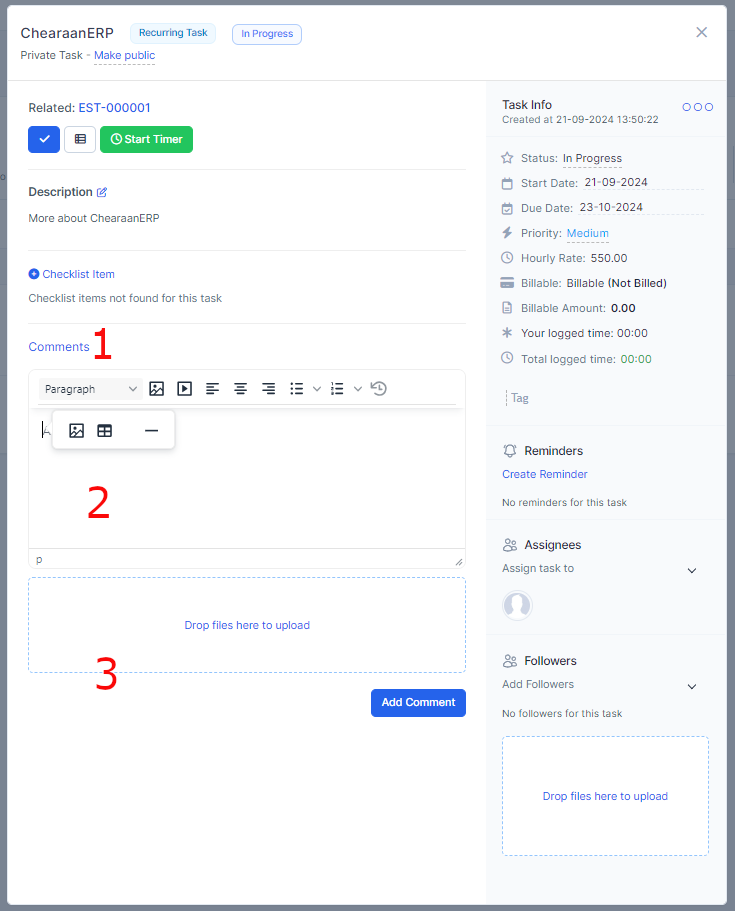To add task comments, inside the task modal, click on the Comments link and click on the empty text area to add comment content.