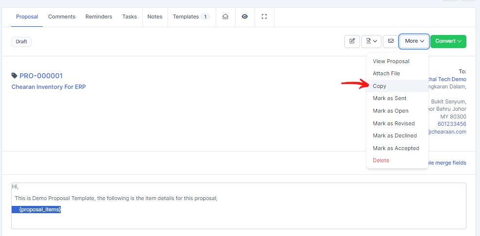 To copy the proposal click on More and click on Copy.