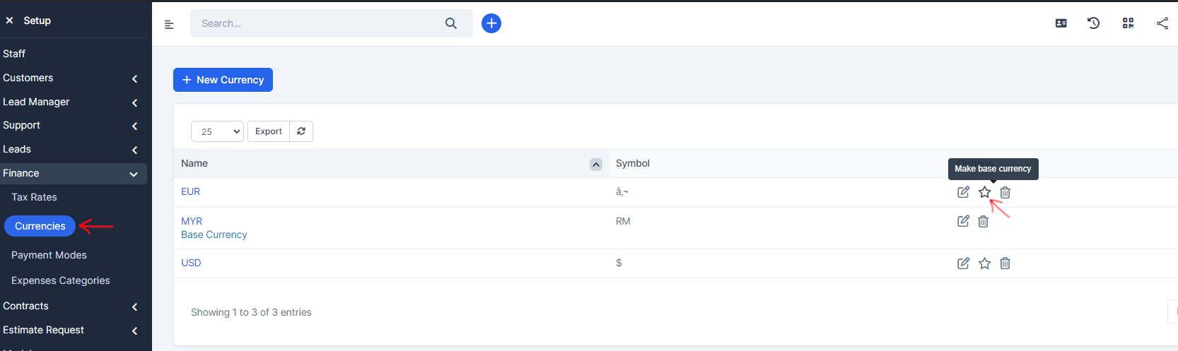 To add new currency go to Setup -> Finance -> Currencies and click New Currency.