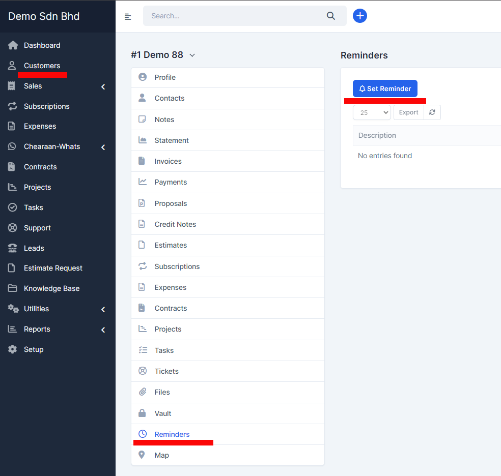 Setting customer reminder is very easy navigate to the customer profile from admin area and click on the reminders tab.