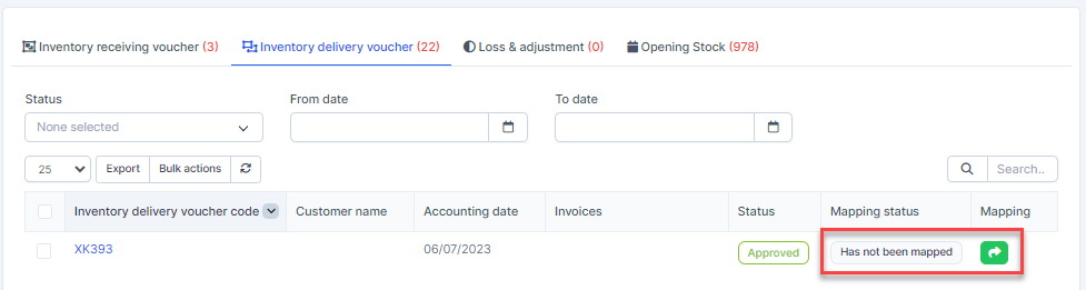 NOTE: If the Inventory delivery voucher mapping is disabled, the inventory delivery voucher is not automatically mapped. Manual mapping is required.