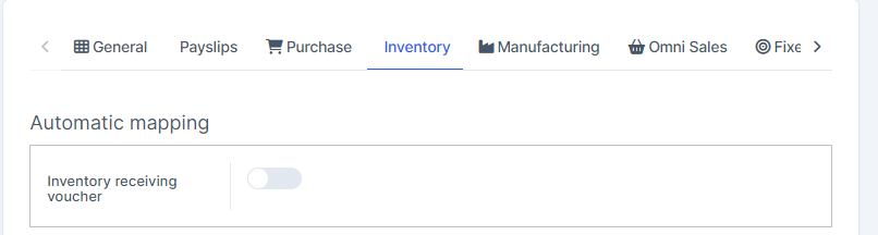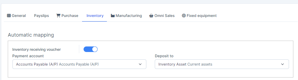 - Step 1. Go to Settings menu under the Accounting module in the left sidebar -> Select the Mapping setup menu -> Select the Inventory tab -> Enable the Inventory receiving voucher mapping setup and select the payment account and deposit to -> Click on the Save button