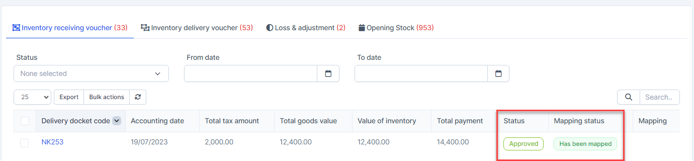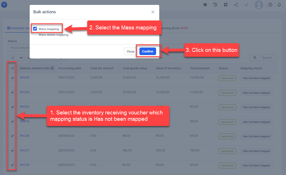 - Step 2. Go to the Transactions menu -> Inventory -> Inventory receiving voucher -> Select the inventory receiving voucher which mapping status is Has not been mapped -> click on the Bulk actions -> select the Mass mapping -> click on the Confirm button