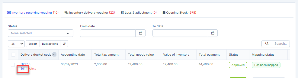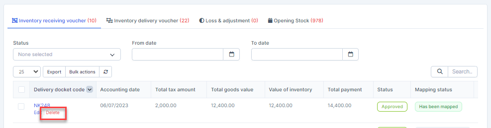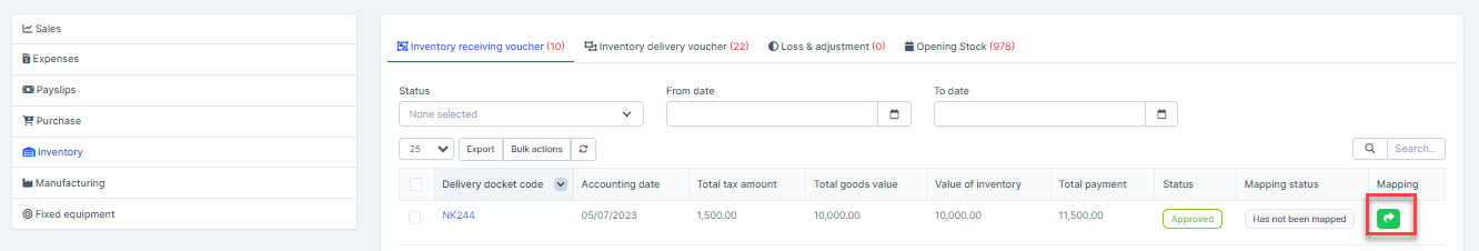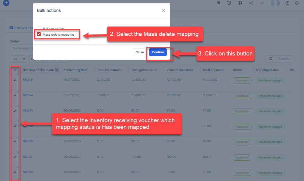 - Step 1. Go to the Transactions menu -> Inventory -> Inventory receiving voucher -> Select the inventory receiving voucher which mapping status is Has been mapped -> click on the Bulk actions -> select the Mass delete mapping -> click on the Confirm button