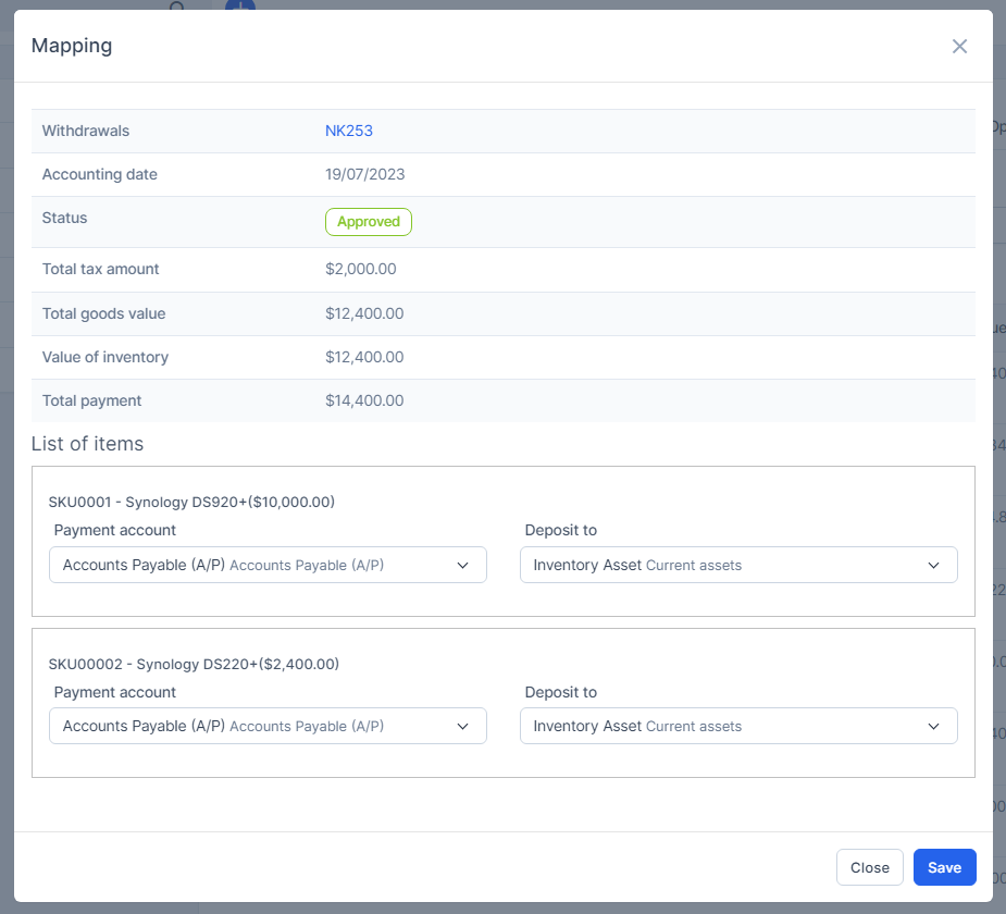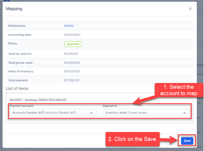 - Step 1. Enable the Inventory receiving voucher mapping setup and select the payment account and deposit to -> Click on the Save button