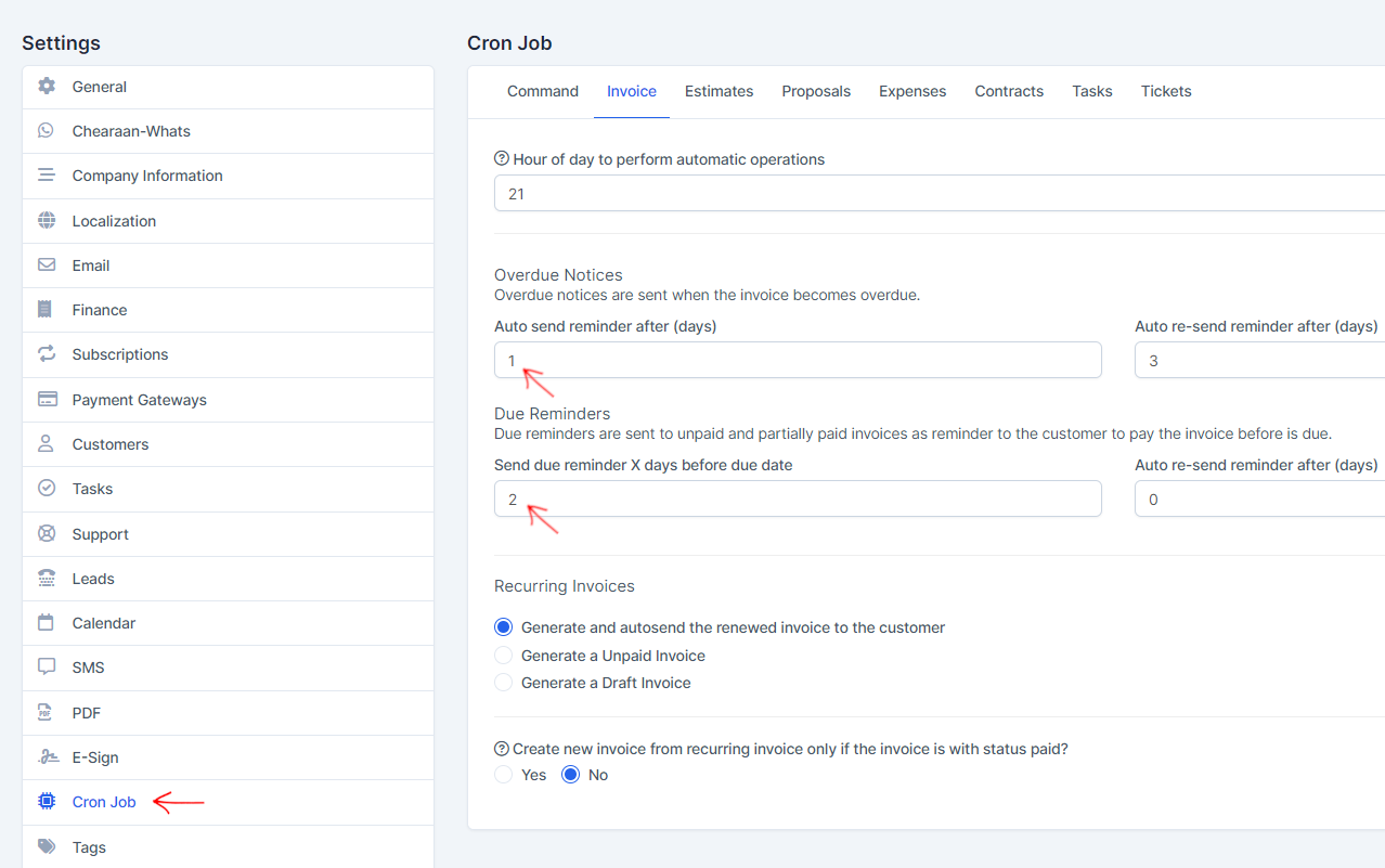 To setup automatically overdue notice go to Setup -> Settings -> Cron Job -> Invoices