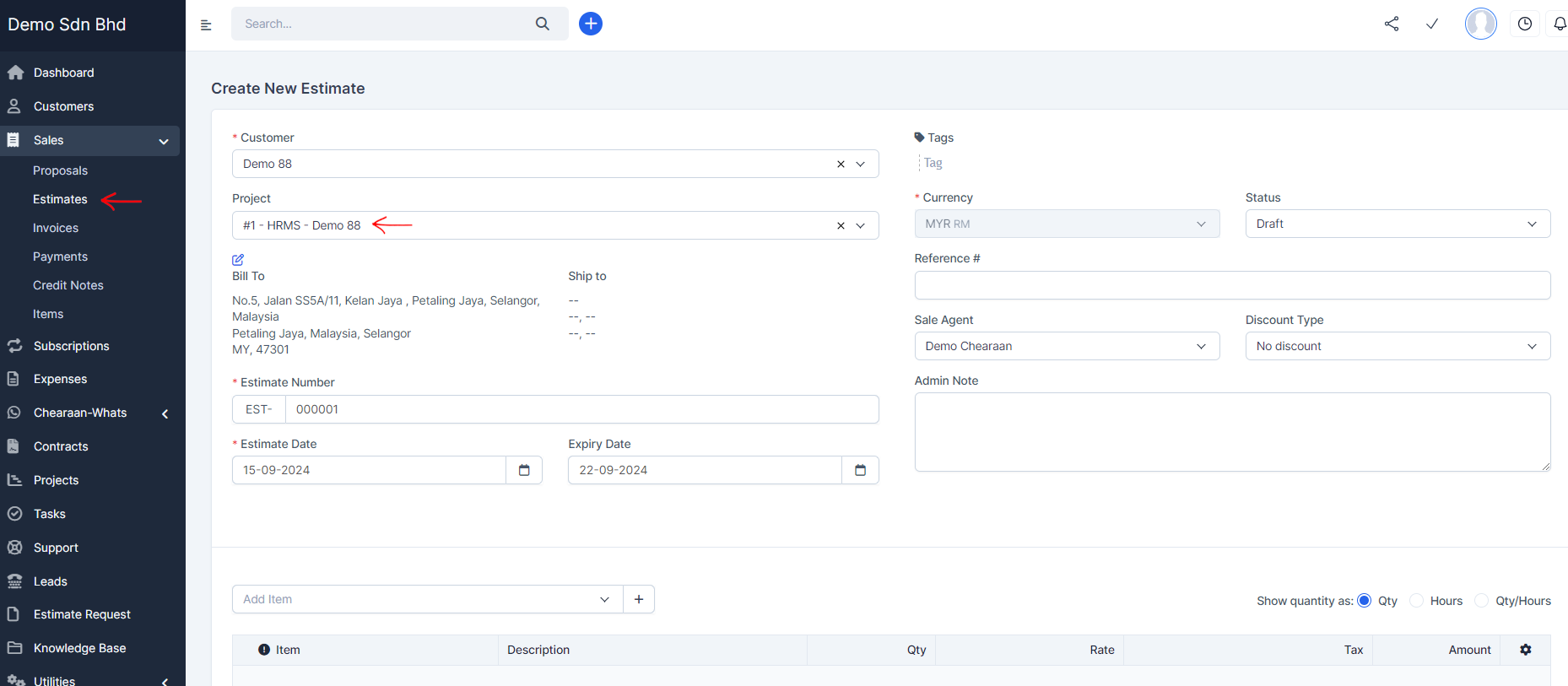 - Go to Menu -> Sales -> Estimates and click Create New Estimate