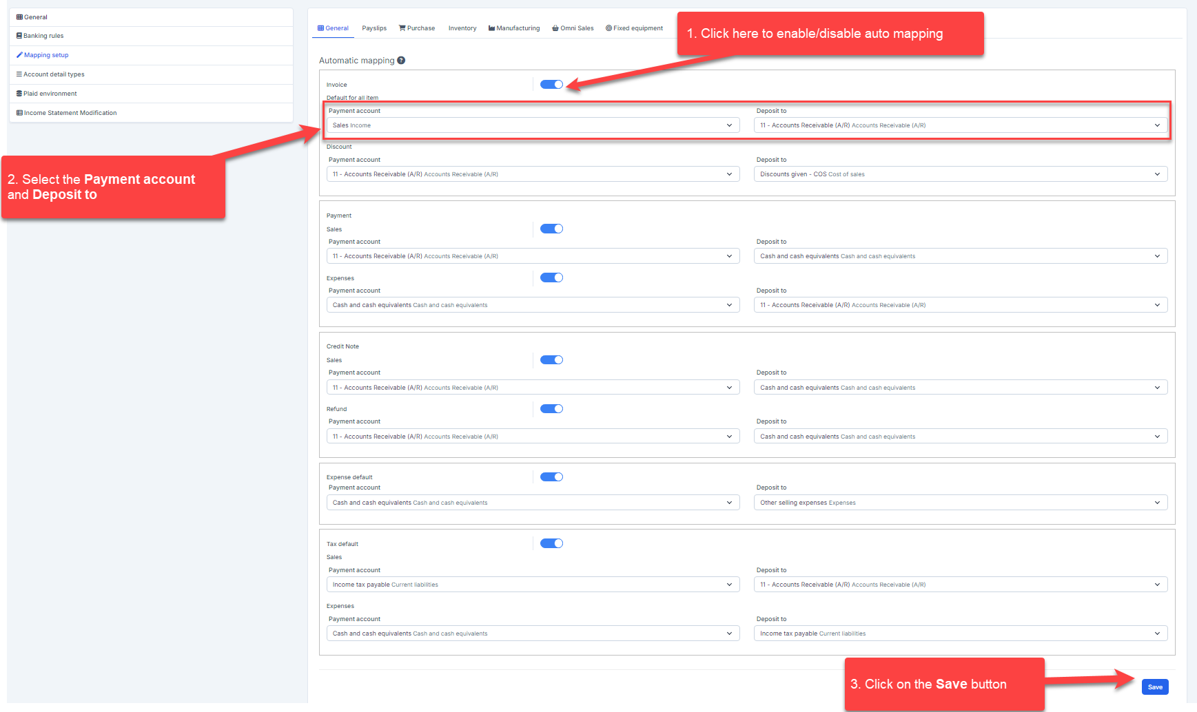 - Automatic mapping: is used to set up automatic mapping for invoice, payment, credit note, expense and tax data.