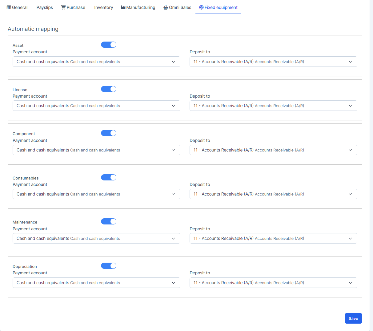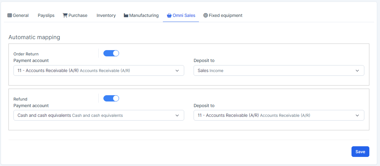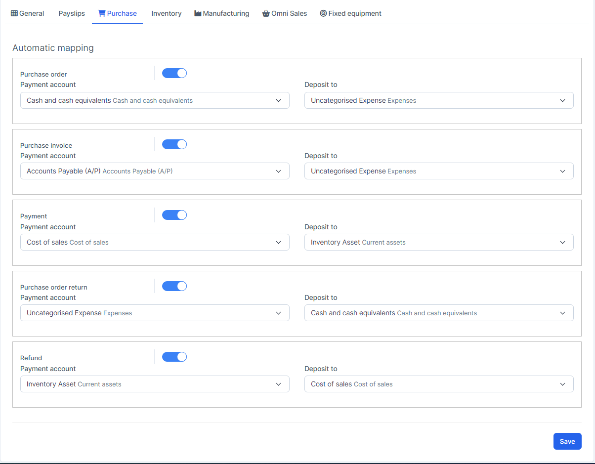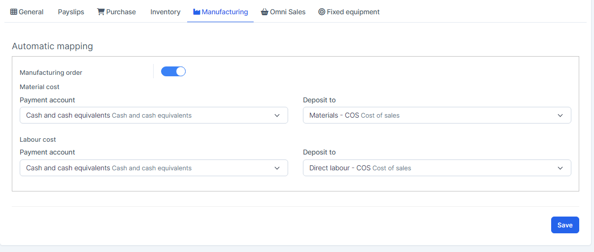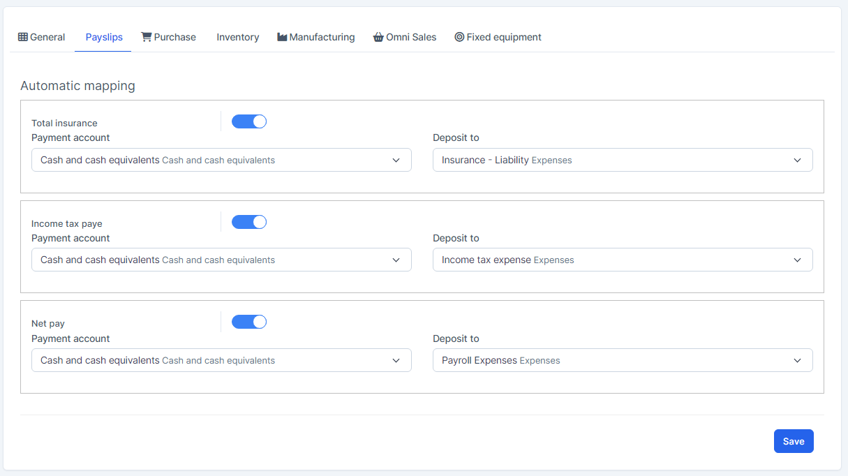 Mapping Setup: is used to set up automatic mapping for invoice, payment, credit note, expense, tax, payslip (if the HR Payroll module is active), purchase (if the Purchase module is active), inventory (if the Inventory module is active), manufacturing (if the Manufacturing module is active), omni sales (if the Omni Sales module is active), fixed equipment (if the Fixed Equipment module is active).