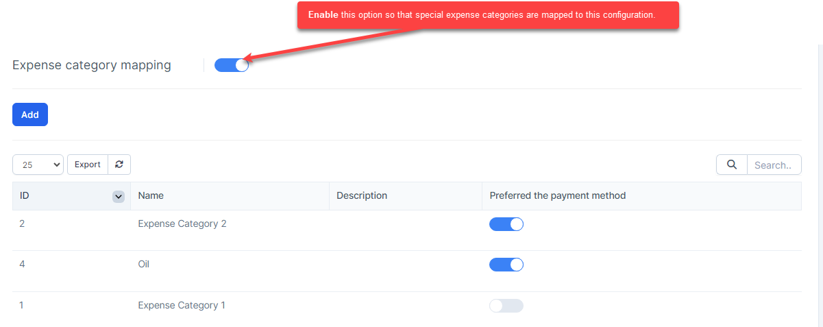 - Expense category mapping: Used to set up automatic mapping for some special expense categories. Expenses relate to the special expense category will be mapped to this configuration.
