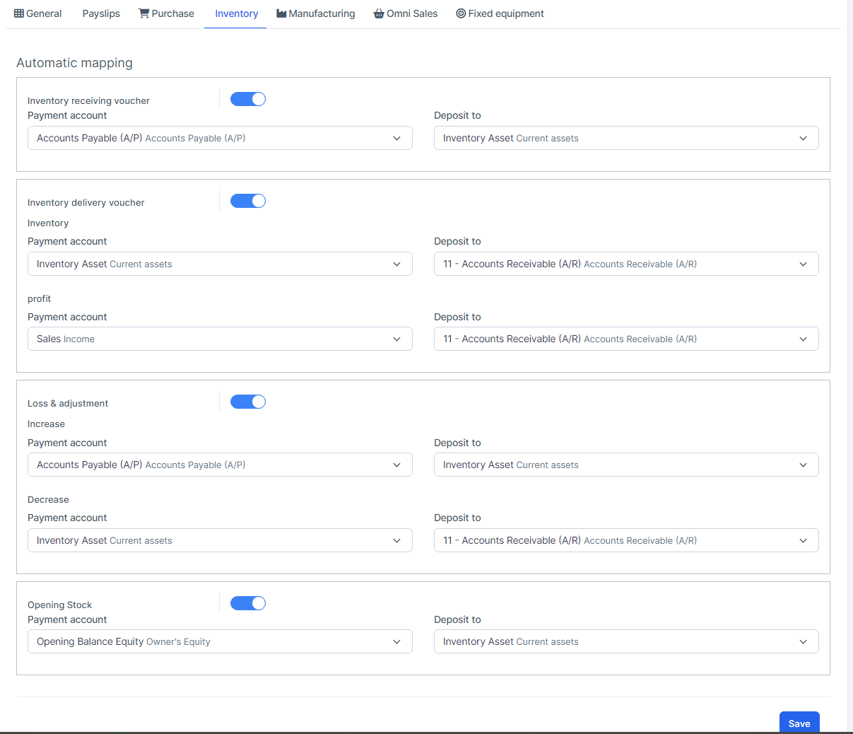 - Automatic mapping of inventory: used to map data about inventory receiving voucher, inventory delivery voucher, loss & adjustment, opening stock.
