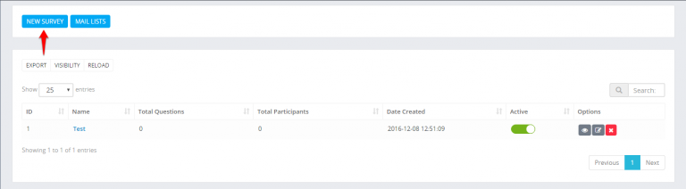 Navigate the the aside menu Utilities and click Surveys – > New Survey.