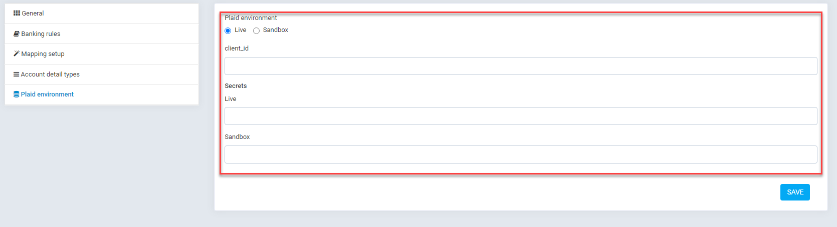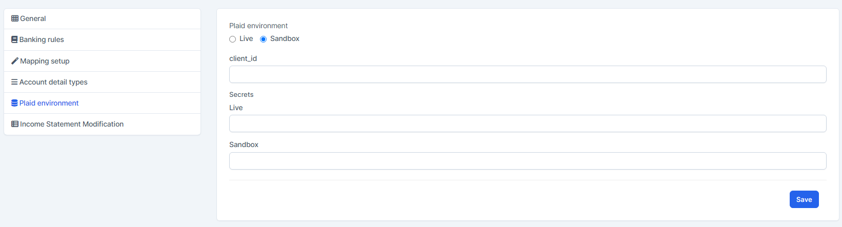- Step 1. First, you need an account of Plaid API to get the key and fill in the Plaid environment in the system.