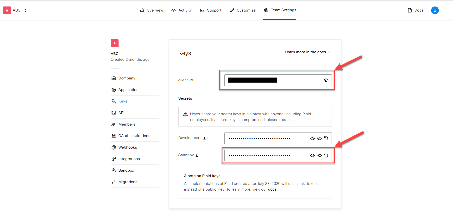 - client_id: This is the identifier of the account on Plaid. We'll take it from the Plaid account.