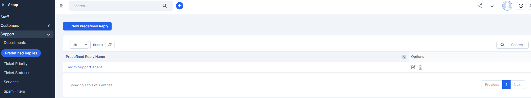 When replying or opening to ticket click on the button Add predefined reply. A popup modal will be opened you only need to click on the plus icon to insert into the reply field.