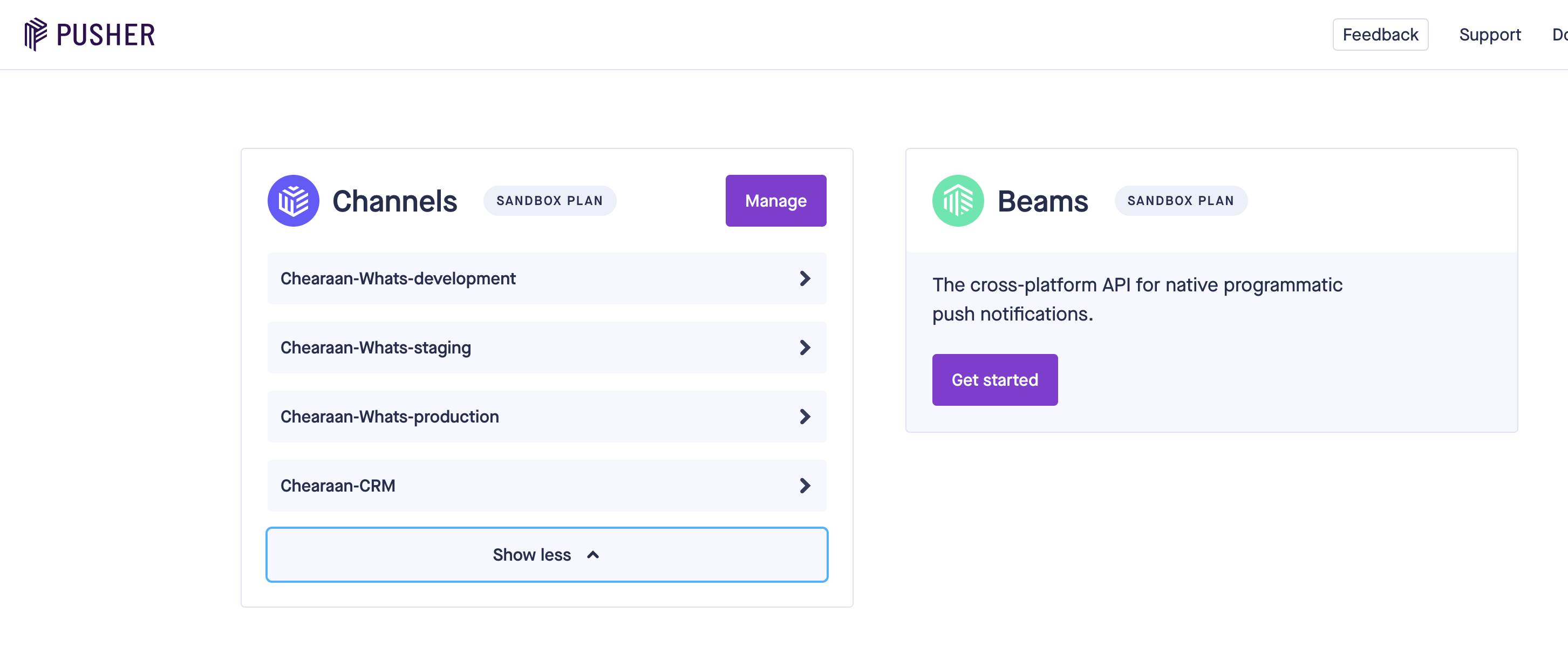 Log in to pusher.com with your account, and in the channels section, click Manage , as shown in the screenshot below.