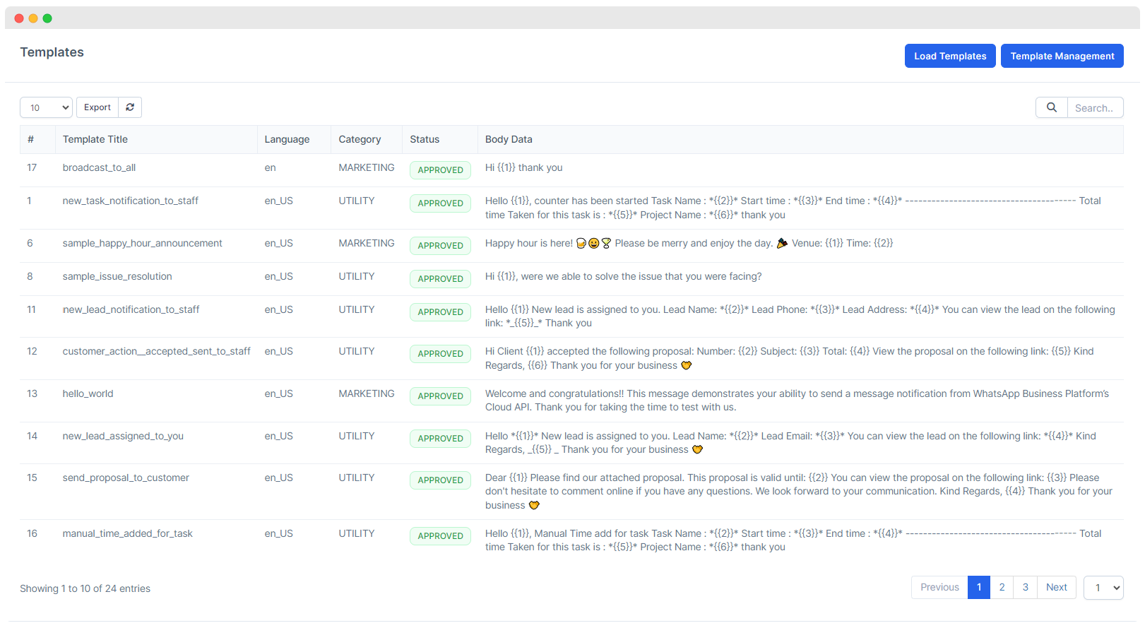 WhatsApp message templates are specific message formats that businesses use to send out notifications or customer care messages to people that have opted in to notifications. Messages can include appointment reminders, shipping information, issue resolution or payment updates.