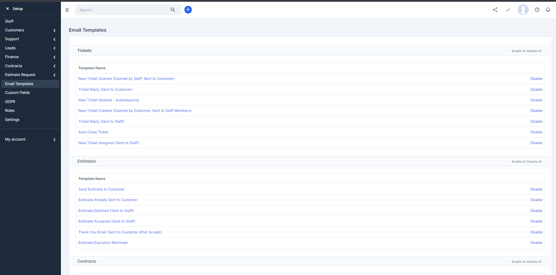 - New Ticket Opened (Opened by staff, sent to customer) – (Sends to customer when ticket is opened from admin area)